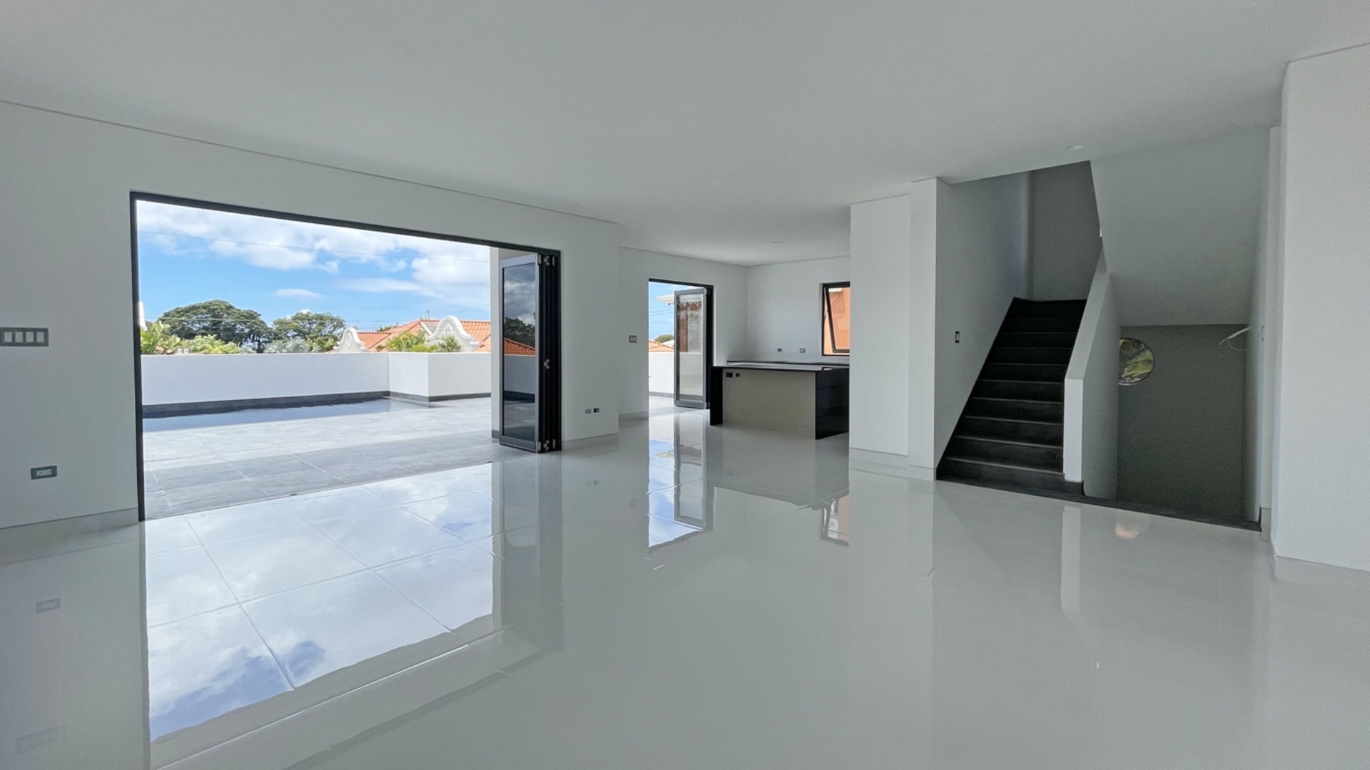 Villa 133 is one of just four exclusive luxury villas situated on the island at the heart of the lagoon. This uniquely positioned property boasts 3 bedrooms and 3.5 bathrooms, complemented by a secluded courtyard filled with lush greenery and a modern office space. Upon entering, the open-plan layout immediately evokes a sense of spaciousness and tropical charm. The ground floor features the living room, dining room, and kitchen, all of which open up to a private patio facing west, offering expansive views of the lagoon.