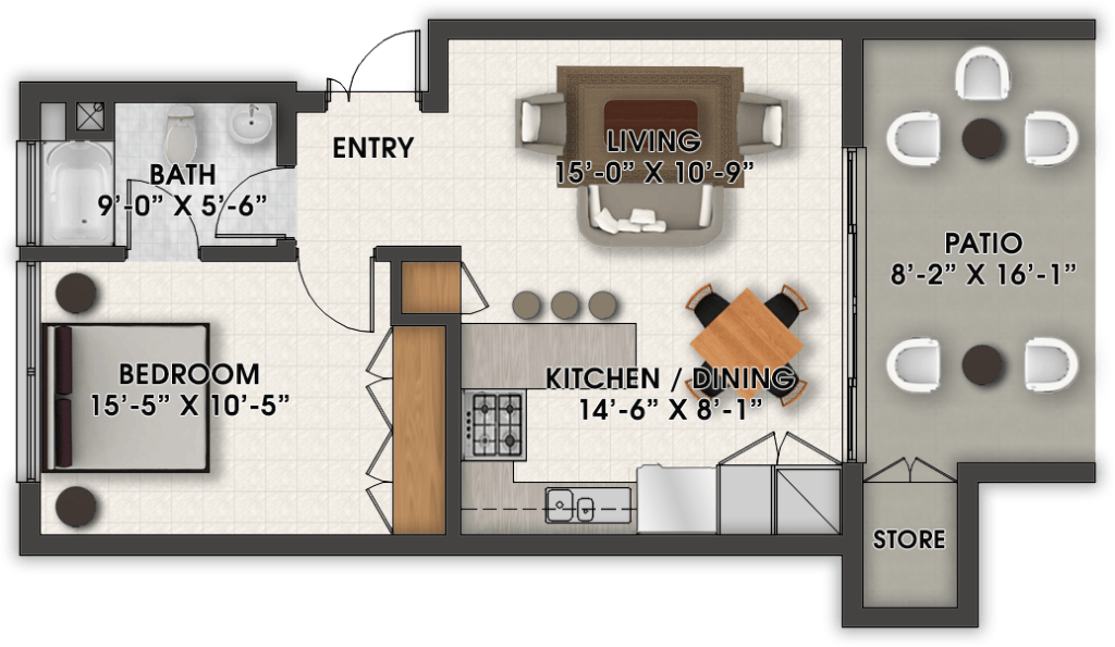 - Each unit has a private, covered patio overlooking the reflecting pool.