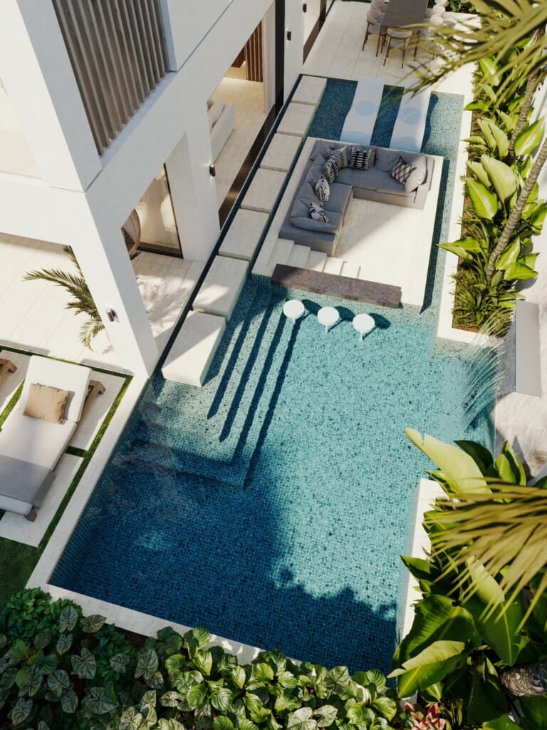 Relax in your private swim-up pool, designed for seamless indoor-outdoor living, surrounded by lush native flora.