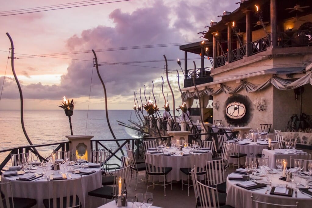 The Cliff’s location is one of its most striking features. Perched above the Caribbean Sea, every table provides a sweeping view of the water. By night, the setting becomes even more enchanting as the restaurant is lit by torchlight, adding a magical glow to the evening. Diners can enjoy the serene sounds of the waves and may even spot stingrays swimming in the illuminated waters below.