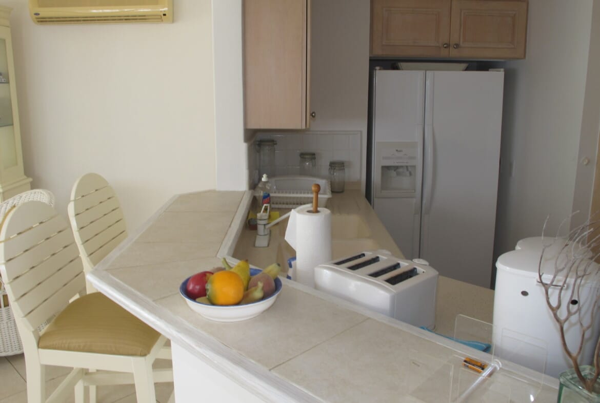 The spacious bedroom is elegantly decorated and includes a large marble-tiled bathroom. For additional comfort, there is a double sofa bed in the living room. Residents can enjoy air-conditioning, ceiling fans, or the cooling trade winds. This intimate apartment combines comfort and luxury with all the amenities of a high-end resort.