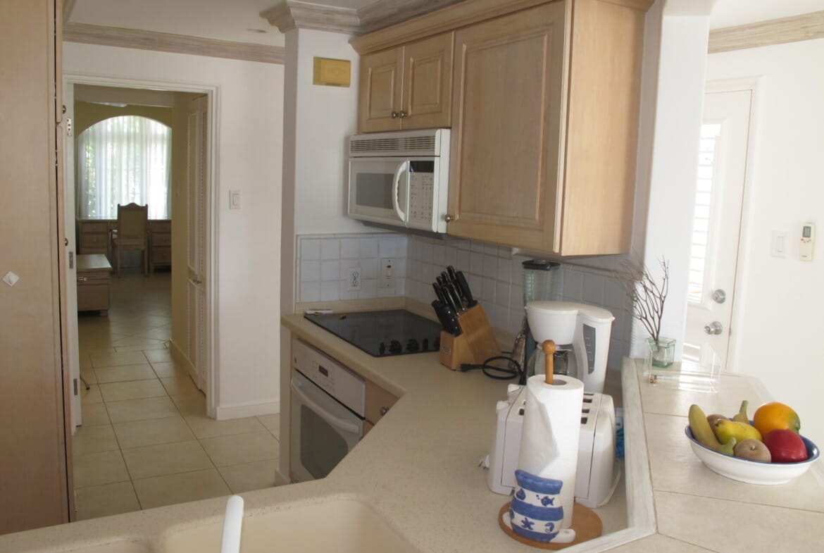 This unique apartment, located on the ground floor at the end of the building, offers a private entrance and is surrounded by beautifully landscaped gardens. Inside, cool tropical furnishings create an atmosphere of informal luxury, providing a peaceful retreat surrounded by the tranquil waters of the lagoon. The living room, with its stunning view of the aquamarine water, opens onto a terrace, offering a perfect spot for outdoor dining just steps from the water’s edge. The well-appointed kitchen is designed for easy living and casual meals, with an open counter area that doubles as a bar or serving space, providing an unparalleled view of the lagoon beyond the terrace. Laundry facilities are discreetly tucked away for convenience.