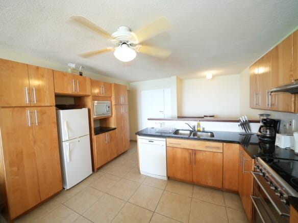 Apartment 2 is a beautifully designed 2-bedroom, 2-bathroom beachfront duplex—one of only seventeen luxury residences in this exclusive development. The open-plan living and dining area seamlessly flows to large picture windows framing uninterrupted ocean views of the jetty, pool, and turquoise sea beyond. The apartment comes fully air-conditioned and furnished with ceiling fans, along with a modern kitchen featuring premium appliances including a fridge, cooker, microwave, dishwasher, washer, and dryer.