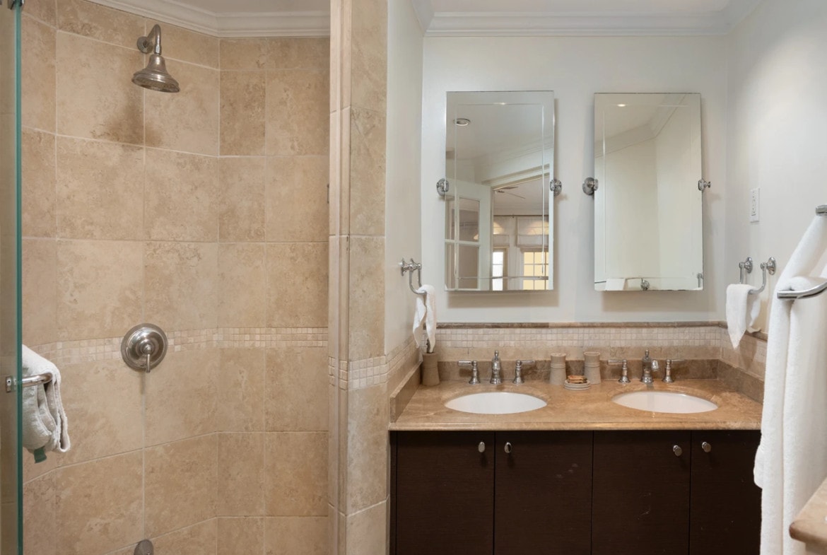 The master suite is a private haven, featuring a king-sized bed, luxurious en-suite bathroom with double vanity, and generous “his and hers” closets, all while capturing spectacular sea views. The second bedroom is equally well-appointed with its own en-suite, walk-in closet, and cozy lounge space complete with TV and seating. A third bedroom, also with a king-sized bed and ample storage, is served by a nearby guest bathroom, ideal for family or visiting guests.