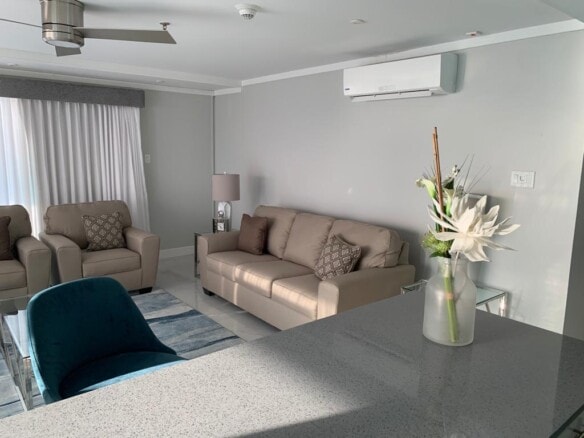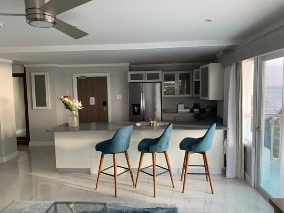 The penthouse features a private jacuzzi and spacious balcony, offering breathtaking views of the Caribbean Sea or the island’s picturesque landscape.