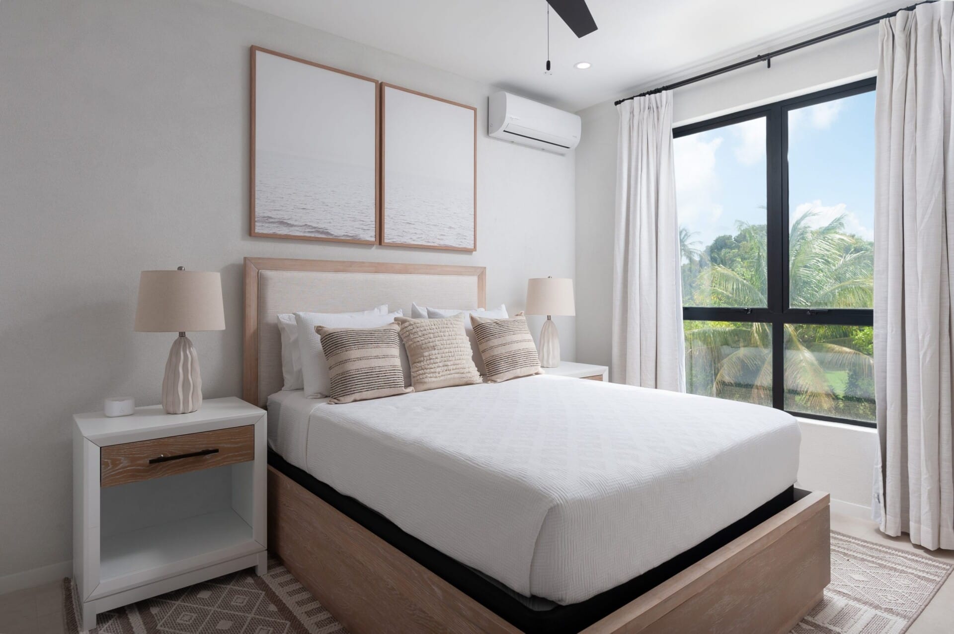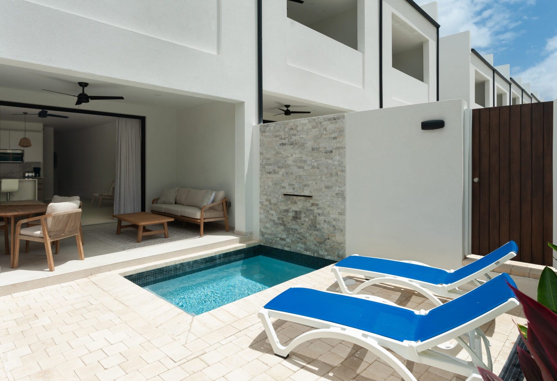 This contemporary three-bedroom, three-bathroom residence offers a relaxed yet refined living experience. The main living area is open and airy, defined by clean lines, recessed ceilings, and stylish lighting. Floor-to-ceiling trifold doors lead out to a shaded terrace, creating a seamless flow to the outdoors where a private plunge pool with a cascading water feature is nestled among tropical greenery—ideal for quiet evenings or casual entertaining.
