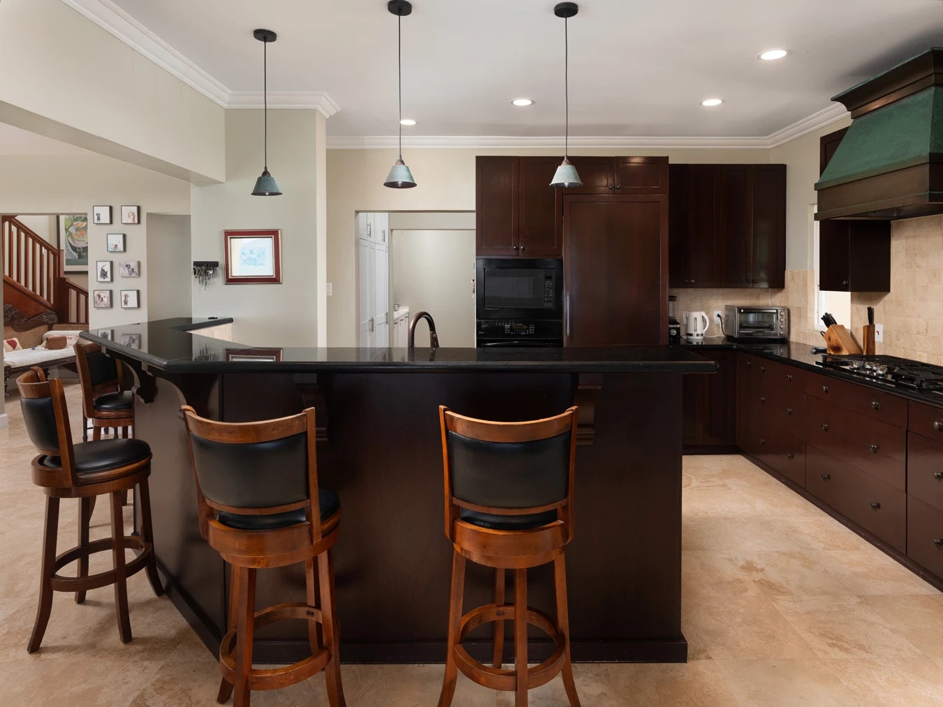A spacious, air-conditioned guest suite is conveniently located on the ground floor and is designed with accessibility in mind. Upstairs, three beautifully appointed bedrooms feature en-suite bathrooms, walk-in closets, and air conditioning. The primary suite is a private sanctuary, offering a wraparound terrace with panoramic ocean vistas—shared by one of the guest bedrooms for maximum enjoyment of the stunning views.