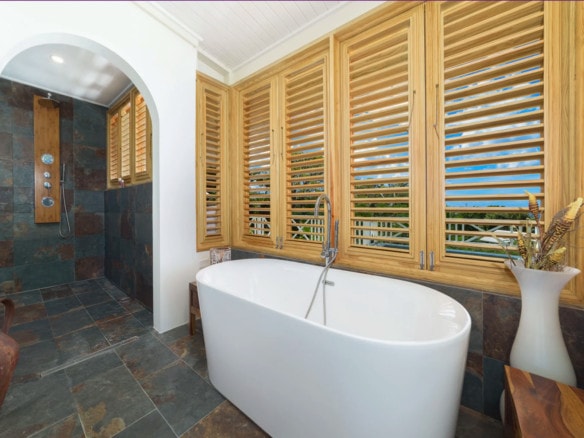 Crafted with sustainability in mind, Northlight features a reliable backup generator and is constructed from locally sourced treated pine, complemented by the elegant cream tones of Purple Heart flooring and quartz kitchen countertops. A striking old coral stone quarry frames the property, offering versatility as additional parking, a croquet lawn, or even a serene natural grotto.
