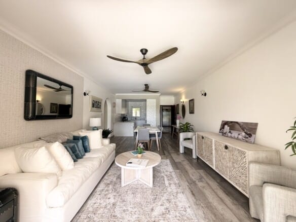 An open-plan layout connects the kitchen, dining and living areas, with the kitchen featuring sleek modern appliances and custom cabinet panelling that blends seamlessly into the space. These spaces flow effortlessly onto a covered terrace, perfect for morning coffee, evening wind-downs or hosting friends as the day cools. Surrounded by landscaped grounds and a serene pool deck, the setting feels private, quiet, and refreshingly unhurried.