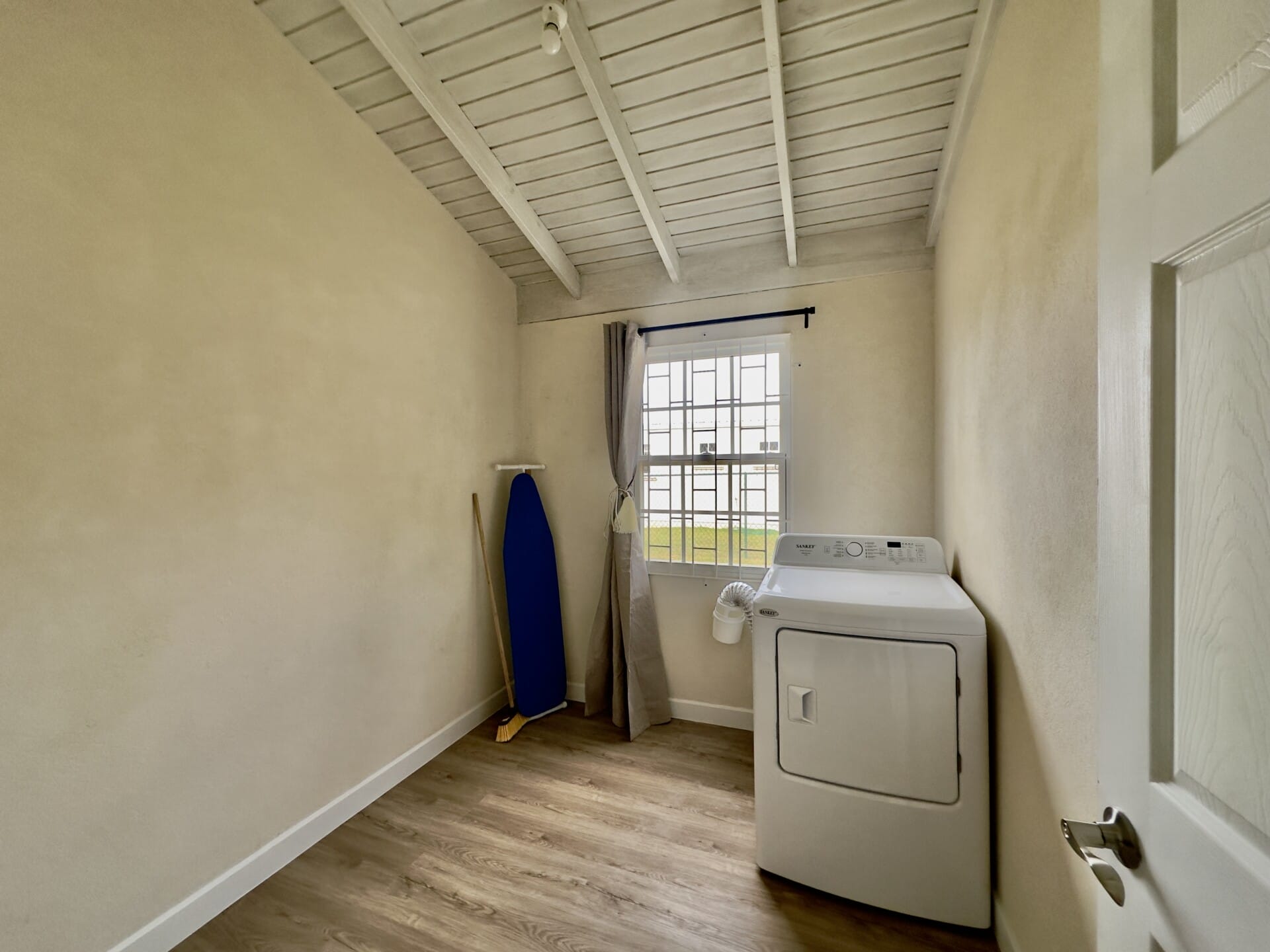 Both bedrooms are thoughtfully designed for restful nights, featuring queen-sized beds, built-in closets, air-conditioning, ceiling fans, and double-layered blackout curtains for ultimate comfort and privacy. The apartment also includes a dedicated laundry room with washer and dryer and an additional storage room for added convenience.
