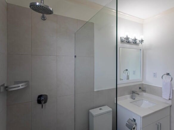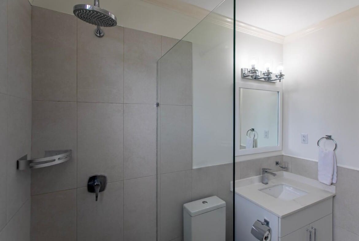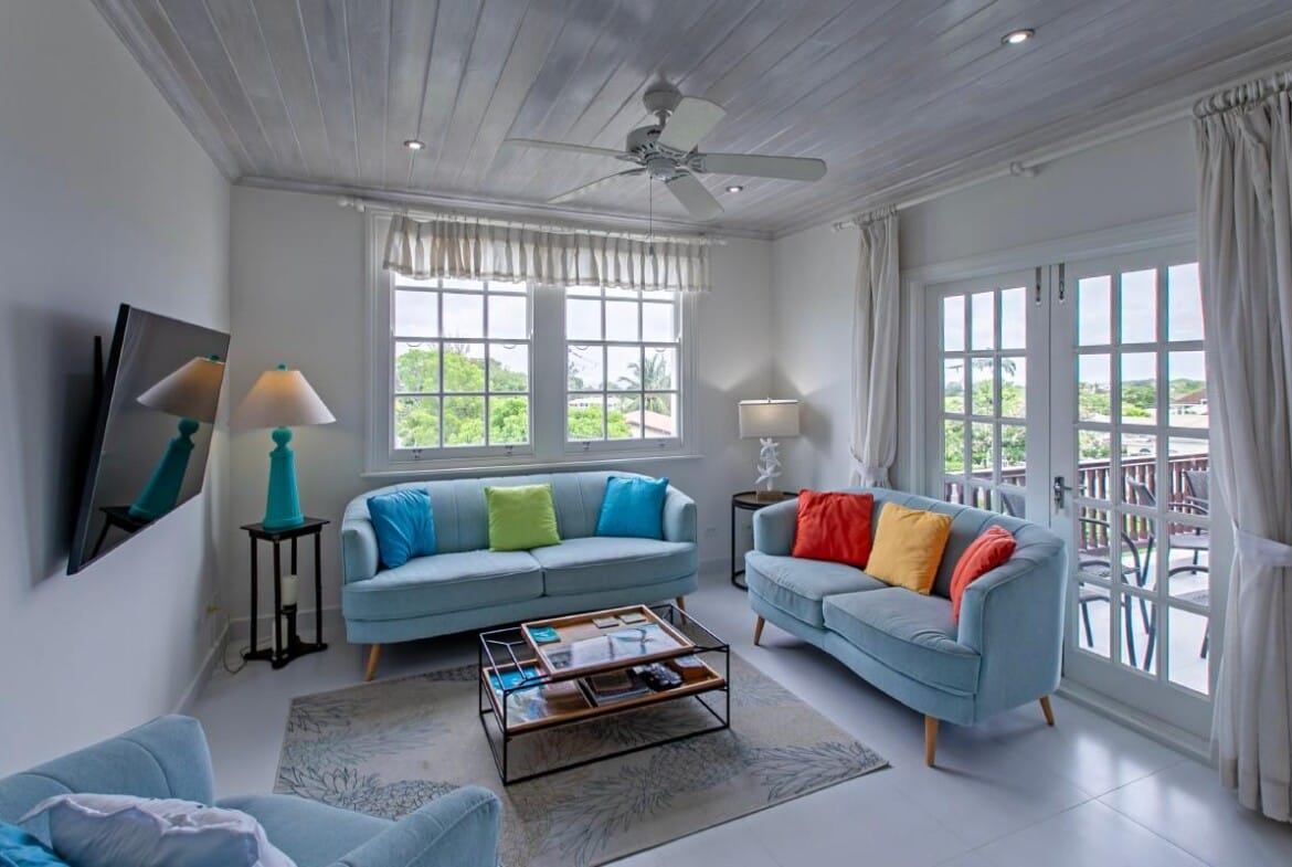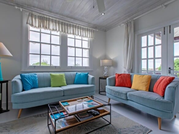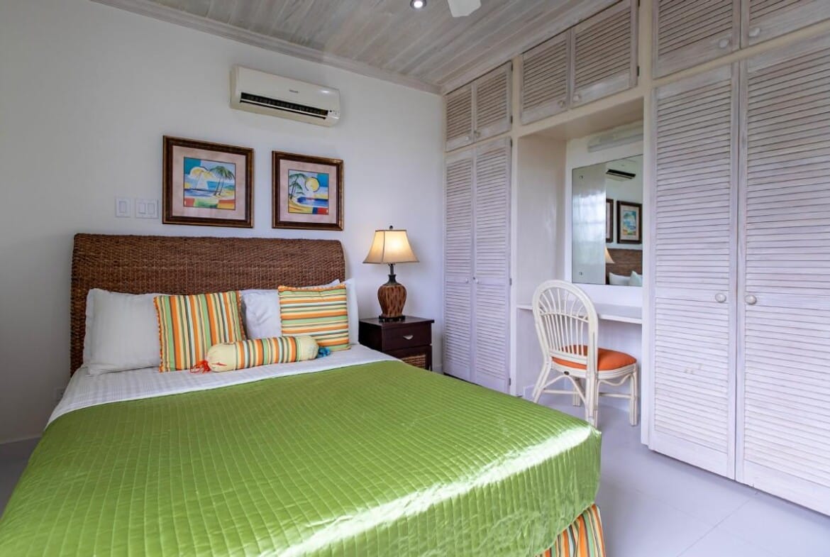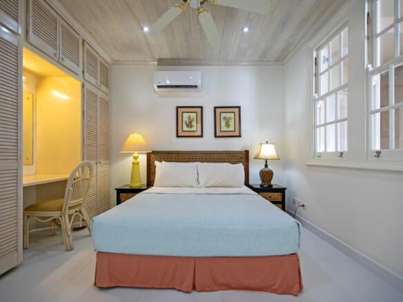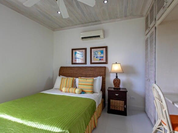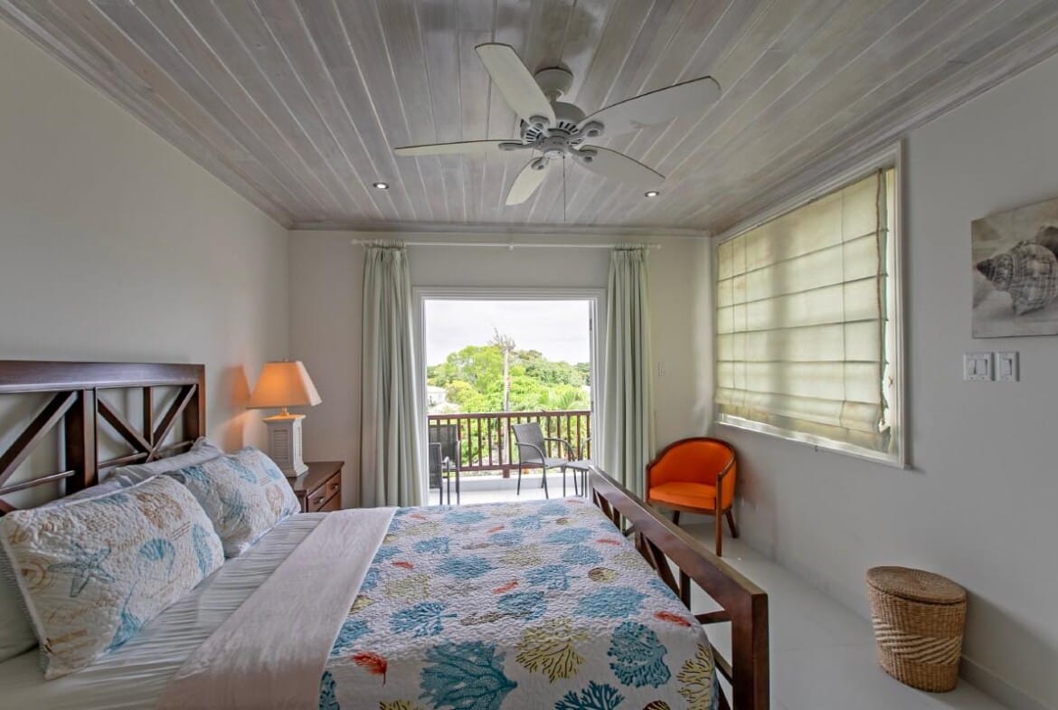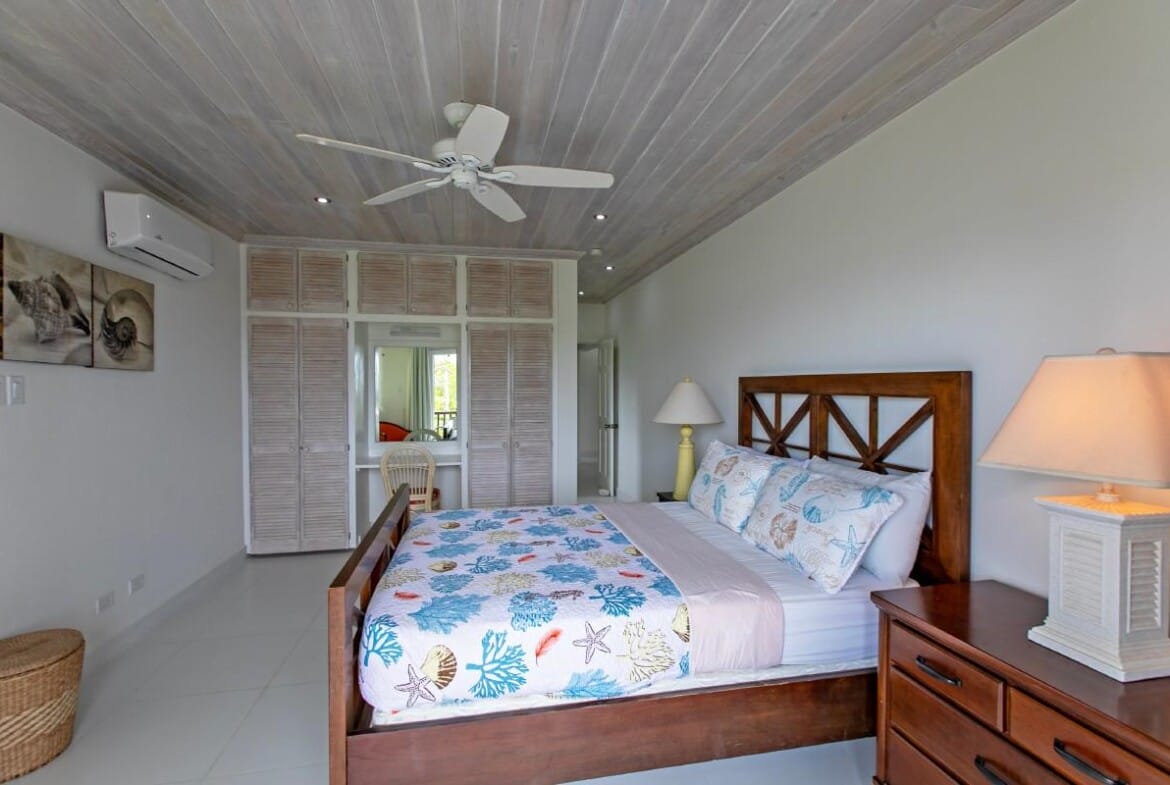 The en suite master bedroom features a queen-sized bed and opens onto a private patio with partial views of the coastline and Caribbean Sea—an ideal spot to enjoy your morning coffee or sunset cocktail. Bedroom two includes a double bed and nearby bathroom access, while bedroom three also has a double bed and its own en suite, making it perfect for guests or family.