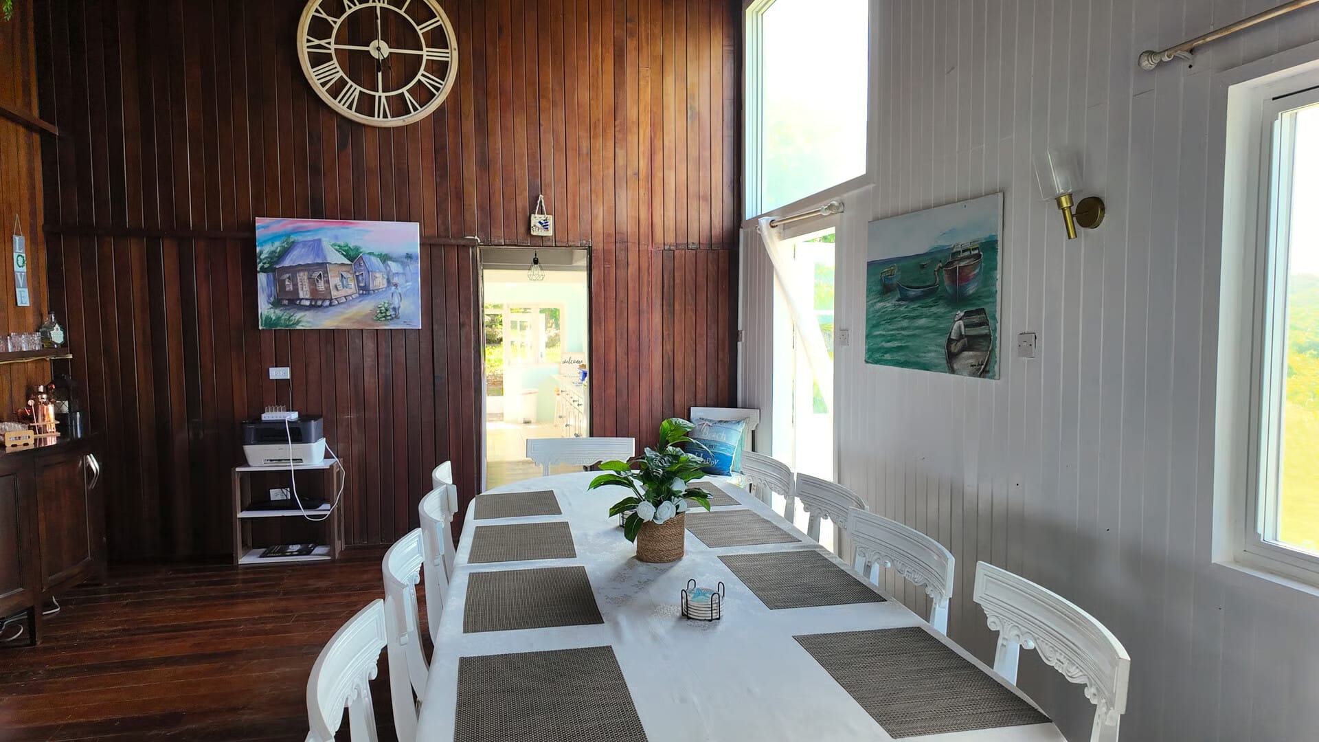 The gourmet kitchen—equipped with modern appliances, air-conditioning, and a charming breakfast nook—offers captivating views of both the ocean and the lush countryside. A convenient laundry area and storage room complete this level.
