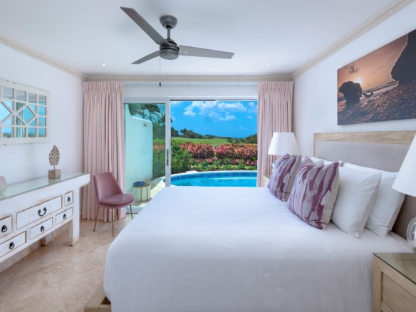- Spacious master suite with a luxury en-suite bathroom and a private sitting area opening onto the garden, pool, and patio via floor-to-ceiling sliding glass doors.