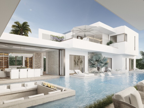 Breezy coastal meets contemporary luxury at Ocean Grove. Seamlessly integrated open plan living encourages effortless entertaining and relaxation, with ocean or water views as the idyllic backdrop. Each home floats amongst water at every intersection, from the front entrance waterfall, 2,412 sq ft saltwater pool with sunken pool lounge, and fire pit, to a 12’ internal waterfall as well a private master rooftop pool with stunning sea views.