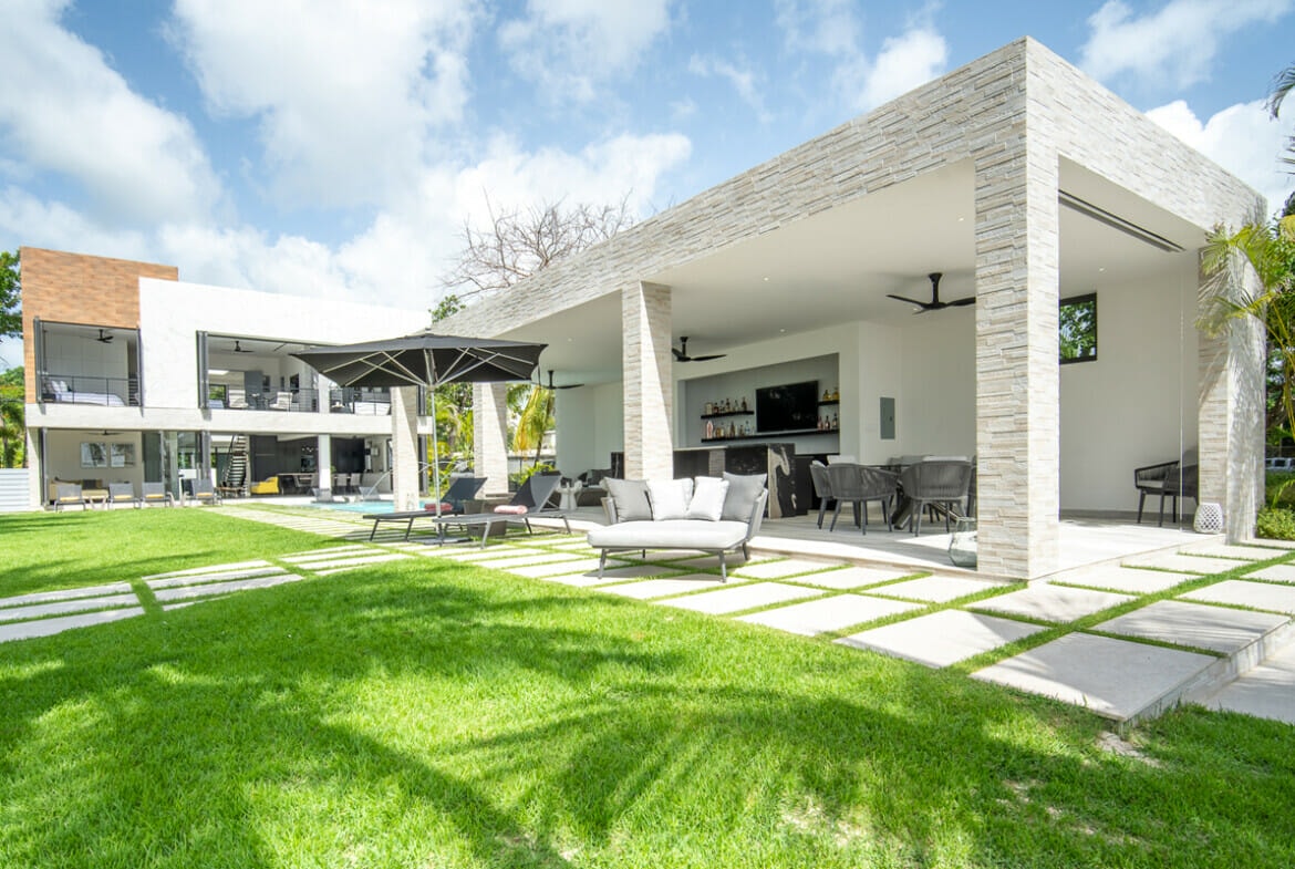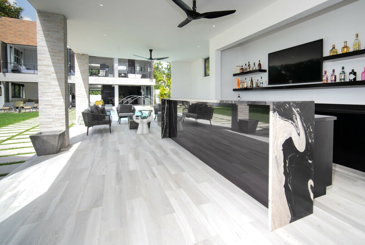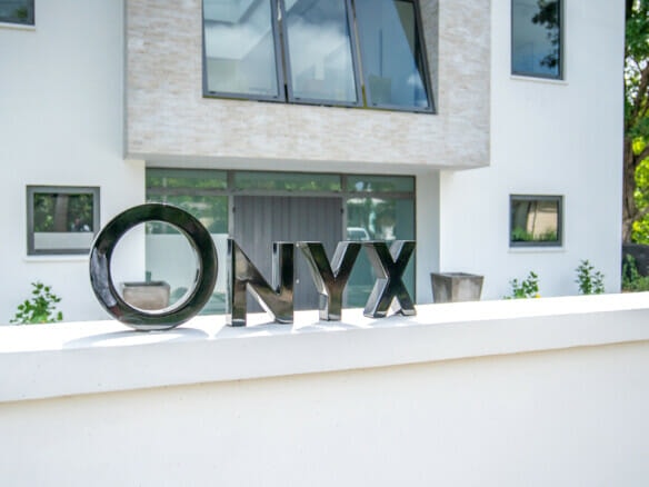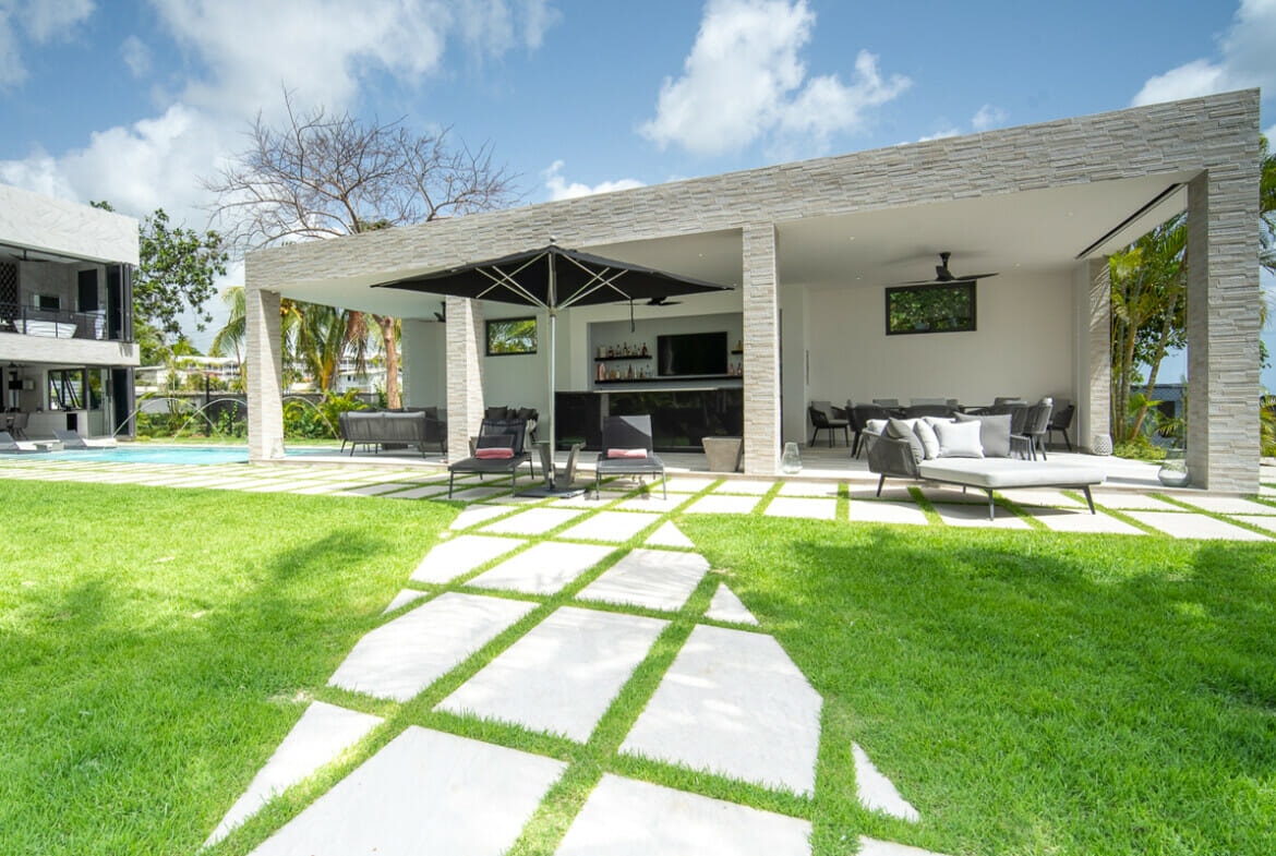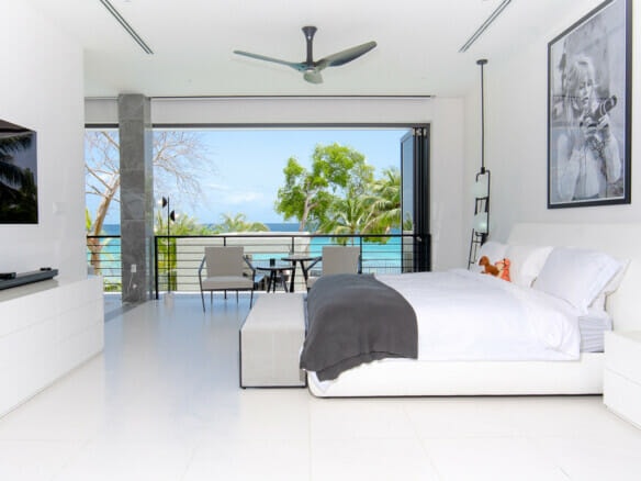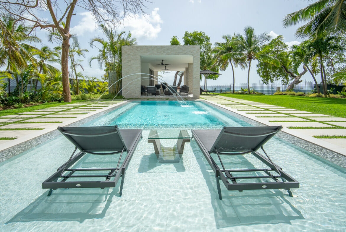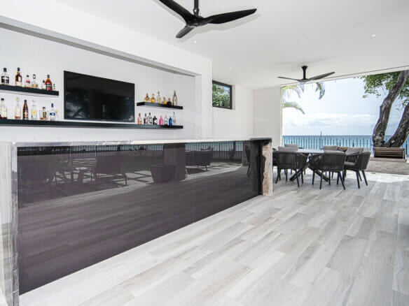 On the ground floor, there is a powder room and another full bedroom. In the living area, accent chairs offer a pop of colour in an Onyx paradise. The sitting area/TV room is quite large and also takes advantage of sea views. There is additional seating in the main living area alongside a dining area that can comfortably host ten persons. There’s even more seating at the bar in the kitchen for an intimate family breakfast. The kitchen is cleverly designed with black panels that seamlessly hide appliances and accentuates the area beautifully. A few steps from the living space takes you outside to a stunning pool. There is a shallow end of the swimming pool with a table for wine or your preferred beverage or snack. Directly ahead is a modern entertainment pavilion with a TV, wine chiller and plenty of seating. The pavilion resembles an upscale outdoor bar and is cooled by ceiling fans and sea breezes. Completing the walkthrough of Onyx villa is direct beach access to a sinfully gorgeous white sand beach. Onyx is a short drive away from popular restaurants like The Seashed, Fishpot and Orange Street Grocer.