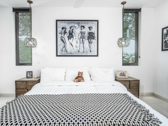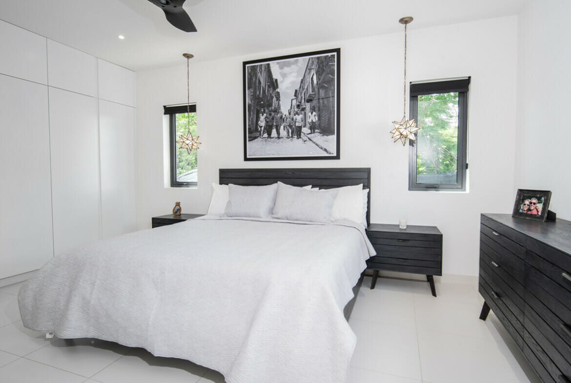 The contemporary design matches the villa name flawlessly throughout with a theme of seductive black and deep greys tempered by white walls and floors, bold geometric décor and striking black and white portraits on the walls. A massive skylight above the foyer lets in natural light and leads you upstairs to one of the most incomparably breathtaking master bedrooms. The master bedroom boasts fantastic views of the coastline, pool and poolside entertainment pavilion. Floor to ceiling windows ensures that you never miss a moment of sea views. The room is spacious enough to accommodate a furnished space for morning coffee. A flat-screen TV is mounted and steps away, a sleek white bathtub is carefully positioned next to the full-length windows. It is the perfect spot to watch a Barbados sunset while enjoying a leisurely soak. The master comprises a separate shower, separate bathroom and endless closet space. It’s simply a luxurious suite. Next to the master is an expansive suite outfitted with a king-sized bed. This room is also decorated in a tasteful style and looks onto gorgeous sea views. There are two additional bedrooms on the first floor with ensuite bathrooms. They echo the same modern theme with black ceiling fans, white floors and bold accent tiling in the showers. An open-air workspace is situated on this level.