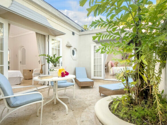 Regular patio doors throughout this main living space lead to the covered terrace, where you will find further formal dining for eight as well as casual seating. The patio extends into the sunshine and surrounds the villa’s private pool, with beautiful gardens beyond.