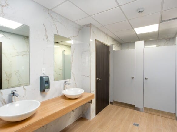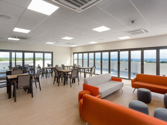 The building also includes a rooftop kitchen and lounge with dedicated bathroom facilities, ideal for staff use, meetings, or private events.