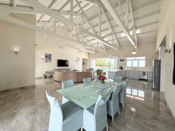 The main living areas are open-plan and carefully oriented to capture natural light, cooling tropical breezes and views of the surrounding landscape and out to the ocean. Large doors open onto a covered terrace and pool deck, creating a seamless transition between indoors and out—equally well suited to quiet evenings at home or relaxed entertaining with guests.