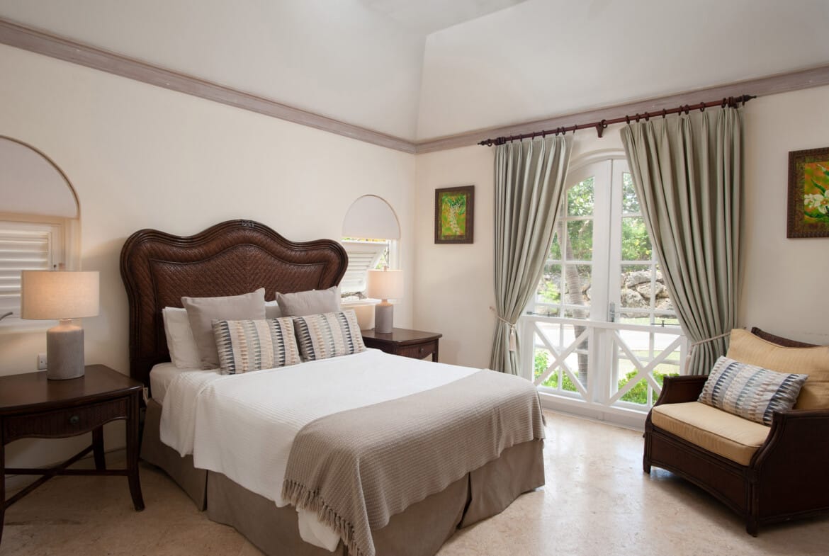 Upon entering this split level, fully detached villa, Bedroom 3 is located to the right, whilst the remaining 2 bedrooms are located on the lower level via stairs on the left. At the entrance, guests will be led to the open plan living/dining area, with the kitchen tucked away just behind. This area boasts high pickled tray ceilings, ceiling fans and double doors which open onto a covered terrace allowing for constant cooling breezes. From the upper level, one will enjoy beautiful views over the pond, lush gardens, and the Caribbean Sea.