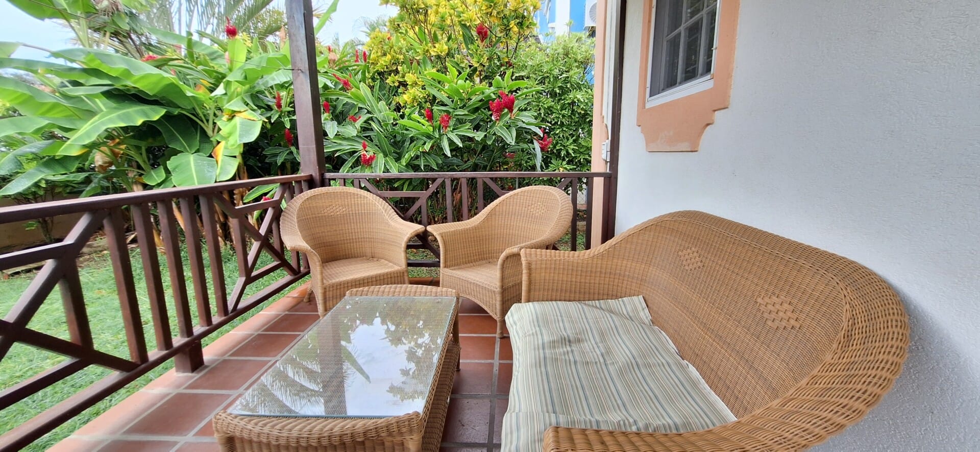 A breezy patio opens onto a small private garden with banana trees and lush greenery, creating a relaxed tropical setting.