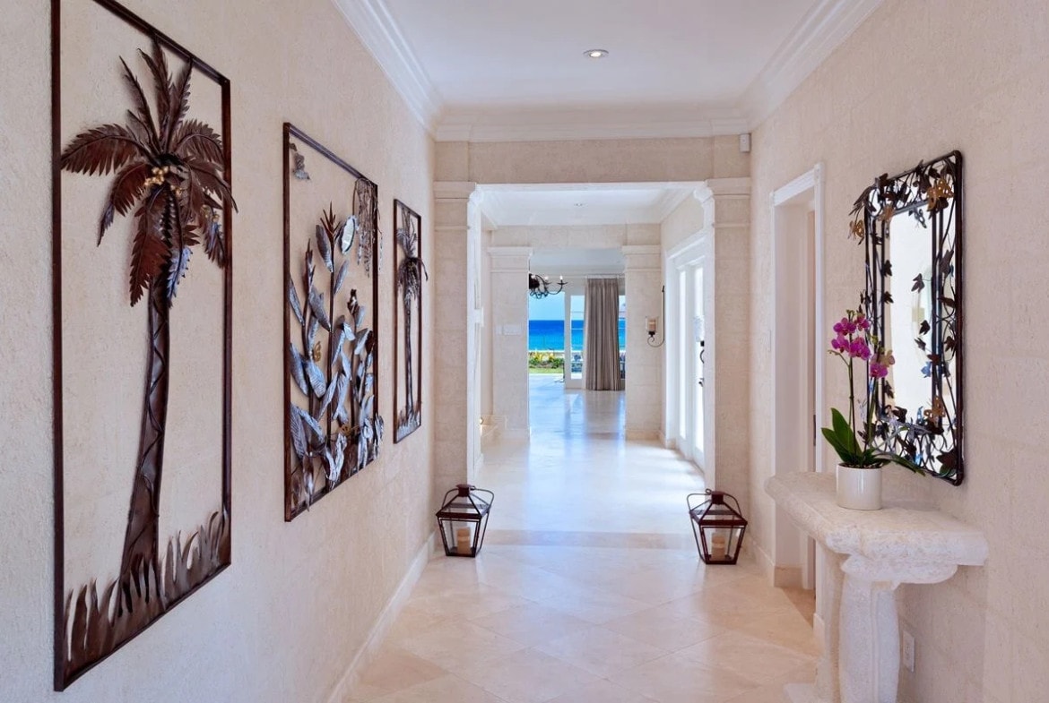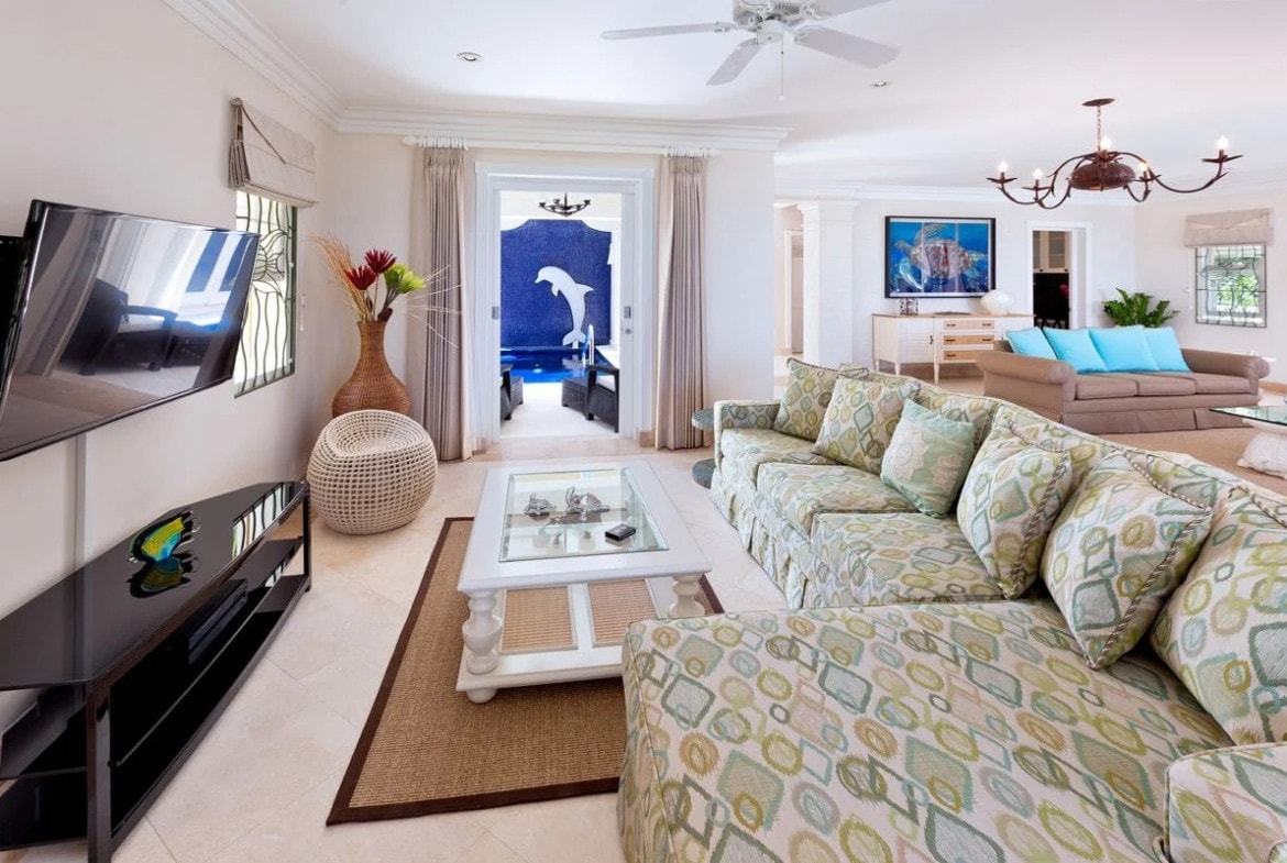 The ground level of this vacation rental features a spacious living room / TV area, which opens directly onto the covered terrace, offering plenty of comfortable seating, as well as an alfresco dining area. The modern and well-equipped kitchen just steps away. All five bedrooms are located on the upper level of the villa, with the master bedroom and bedroom 2 having balconies directly overlooking the garden and ocean. All of the bedrooms are air-conditioned, with ceiling fans and en suite bathrooms. There is also a small TV room on the upper level. The décor of the villa is stylish, featuring cool blues and bright tropical colours with whimsical touches of an “undersea” theme.
