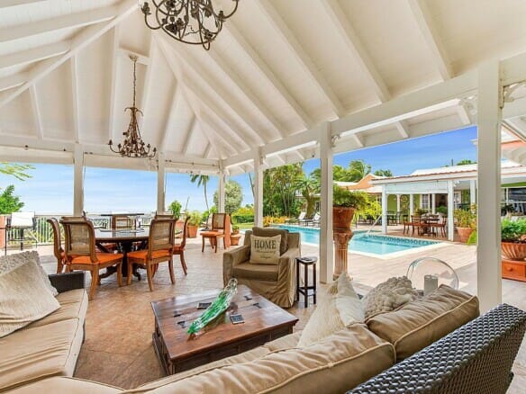 On the ground floor is a living room and kitchen. There is also a formal dining room. This opens onto the covered terrace which offers living space and casual dining. There is a bar here. It is the perfect spot to relax and entertain. A wonderful place to watch the sun set. Also great for hosting parties.