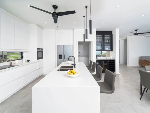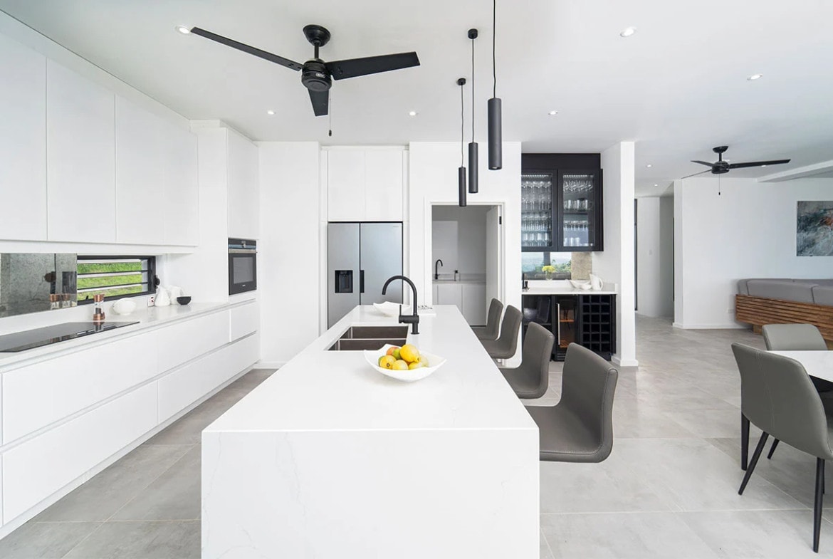 On entering the home, the lobby flows into a vast open-plan living area, seamlessly connecting indoor and outdoor spaces. The large sliding doors allow for endless tropical breezes and views from the spacious terrace, perfect for entertaining and overlooking a 46-foot saltwater swimming pool. This villa offers exceptional culinary amenities, from the main kitchen to the separate chef’s kitchen and staff facilities. As for other amenities, this property has everything you could dream of, including a media room, gym, private office, and a rear lawn with badminton and volleyball nets. Guests can also enjoy al fresco dining with the outdoor kitchen and BBQ.