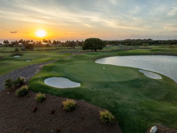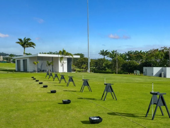 All three air-conditioned bedrooms are luxuriously appointed, each featuring an en-suite bathroom with frameless glass showers and premium Kohler fixtures. The master suite further elevates the experience with a jacuzzi tub overlooking the fairway and sea, an in-ceiling rain shower, dual vanities, walk-in wardrobes, and its own private balcony.