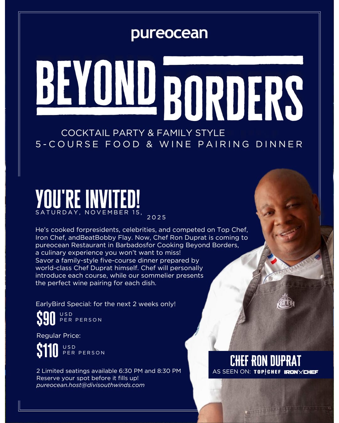 Join Chef Ron Duprat — celebrated for appearances on Top Chef and Iron Chef — for an evening of fine dining under the stars. This exclusive five-course wine-pairing dinner showcases bold Caribbean flavors with international flair.