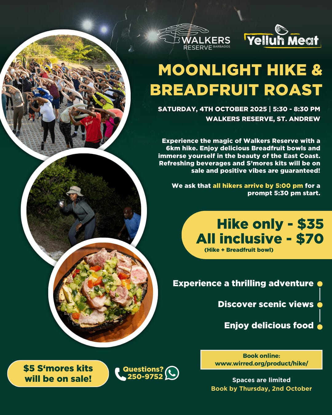 Kick off October under the stars with a guided 6 km moonlight hike at Walker’s Reserve. This moderately challenging trail takes you through rugged terrain and hill climbs for a rewarding evening workout. After the trek, enjoy a traditional breadfruit roast in collaboration with Yelluh Meat.